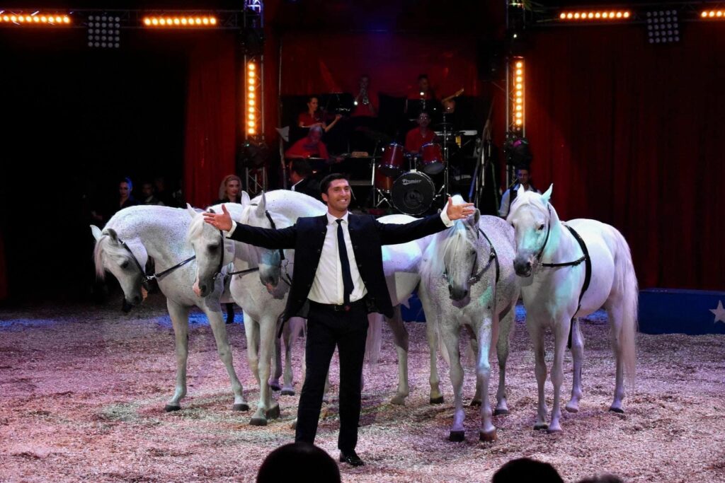 József Richter Jr. presents a second equine number, reminding us that traditional circus in the ring was founded on animal acts in the form of equestrian displays. In this number, he works harmoniously with his liberty horses, demonstrating the relationship between horse and man, which is based on reciprocal trust and complete respect, both absolutely necessary to produce a performance that is both technically seamless and artistically pleasing to audiences of all ages. József Richter Jr. has ample experience of working with animals: he has performed with camels, llamas, Arabian horses, Friesians, giraffes, bulls, and even with the Indian elephant called Szandra, which worked with Roger Moore in a James Bond movie. In 2014, József Richter Jr. and his troupe won the Golden Pierrot Award at the tenth International Circus Festival of Budapest, and he is the only Hungarian performer to have achieved that distinction.