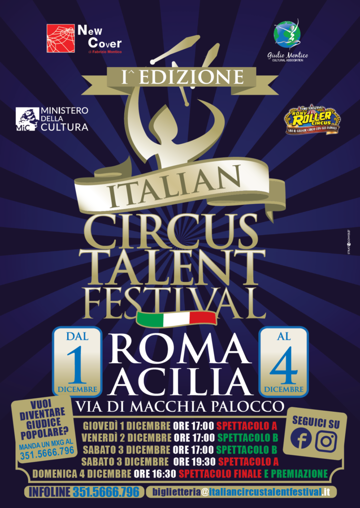 Fitto calendario degli spettacoli, veri fuoriclasse alla Direzione di Pista, amatissimi presentatori, l’inedita “giuria popolare”: sono solo alcuni tra gli highlights della prima edizione dell’ Italian Circus Talent Festival. Dal 1 al 4 Dicembre la pista di Roma – Acilia sarà fulcro esclusivo dei nuovi talenti del Circo italiano.