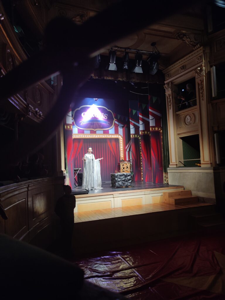 Romy Maggiolaro ha dato un saggio della sua grande abilità nell’antipodismo, che nella parte finale del numero diventa incredibilmente “aereo”, con l’artista sollevata da un’imbracatura al centro del teatro.