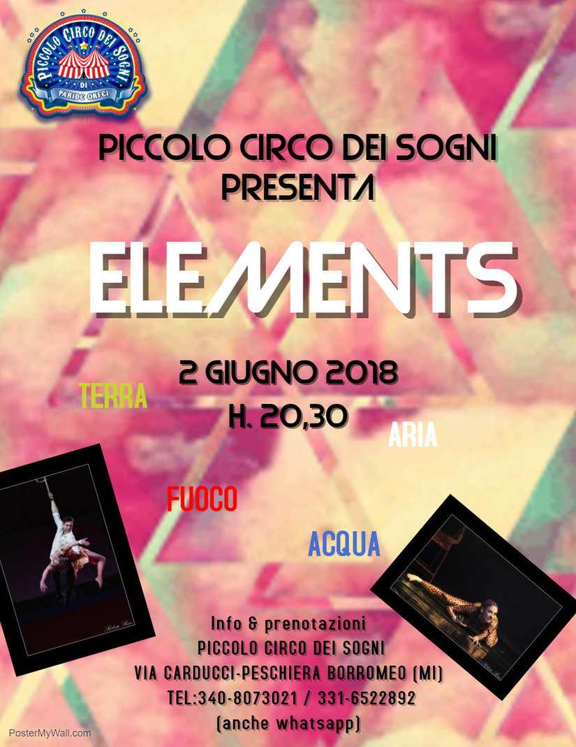 Un sorprendente spettacolo circense sta per debuttare al Piccolo Circo dei Sogni di Peschiera Borromeo (Milano). “Elements”, in programma per la serata di sabato 2 giugno, a partire dalle ore 20.30, è la rappresentazione dei quattro elementi naturali (fuoco, aria, acqua, terra) in chiave artistica. La perfezione della natura si esprime attraverso la bellezza dei corpi umani nello show ideato da Paride Orfei e Sneja Nedeva, in cui si alterneranno 25 artisti.