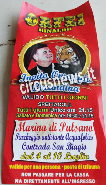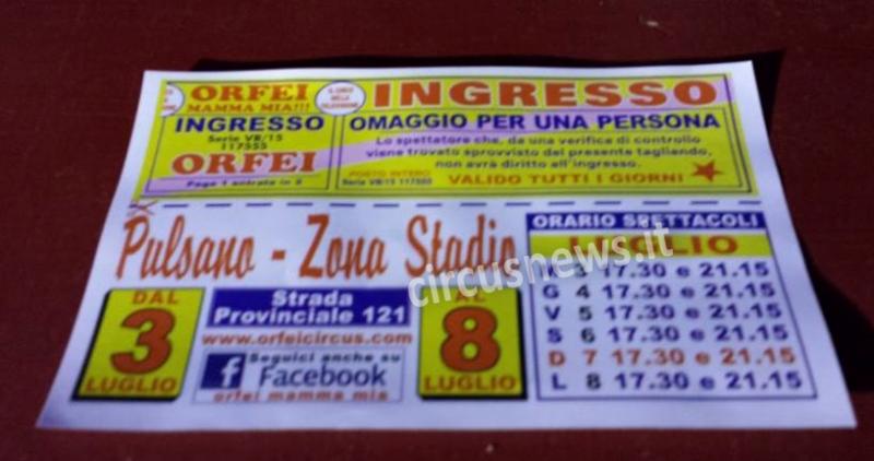 Il Circo Orfei “Mamma Mia” di Darix Martini ha installato le proprie strutture vicino lo Stadio di Pulsano, lungo la Strada Provinciale 121. Gli spettacoli si tengono dal 3 all’ 8 luglio tutti i giorni alle ore 17.30 e alle ore 21.15.