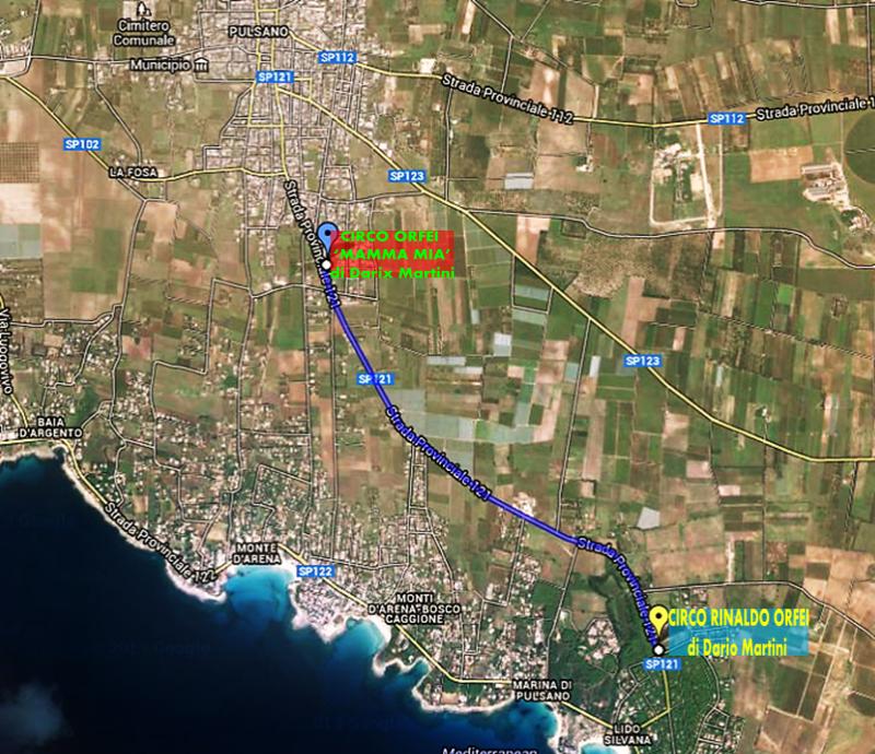 Il Circo Rinaldo Orfei di Dario Martini invece si trova a Marina di Pulsano, in Contrada San Biagio vicino il parco acquatico Acquafolies.