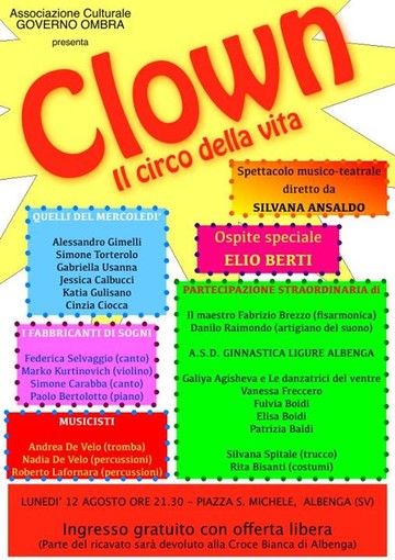 Clown – Il circo della vita, spettacolo unico presentato da Associazione Culturale Governo Ombra, si terrà Lunedì 12 Agosto 2013 sul Palco di Piazza San Michele ad Albenga. Ingresso Gratuito con offerta libera: il ricavato sarà in parte devoluto alla P.A. Croce Bianca di Albenga.