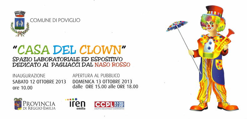 Il prof. Agide Cervi ci informa della inaugurazione della “casa del clown” a Poviglio (RE) in via Parma n°1 c/o Centro Culturale, che si terrà nei giorni di sabato 12 ottobre 2013 alle ore 10.00 e domenica 13 ottobre dalle ore 15.00 alle 18.00.