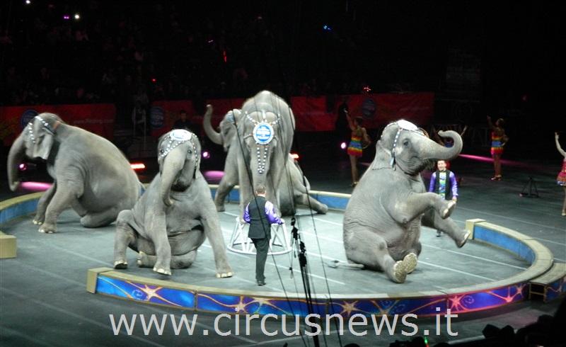 Entra la parata che rende celebre il complesso: elefanti, pony, i vari artisti con un saggio delle loro specialità, il nano Paulo Dos Santos che vola sulla scena spargendo scintille e due mega carri rispettivamente con l’annunciatore e con Alexandre Lacey. Le tre piste sono colme di colori, la megalomania circense è elevata a potenza dalla megalomania dello spirito Usa, il nome della produzione è ‘Legends’. Lo spettacolo è avvincente, a ritmo elevatissimo.