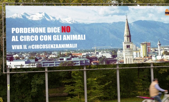 Attraverso un fotomantaggio è stato proiettato un manifesto che recita – sopra una veduta della città – “Pordenone dice no al circo con gli animali. Viva il #circosenzaanimali!”.