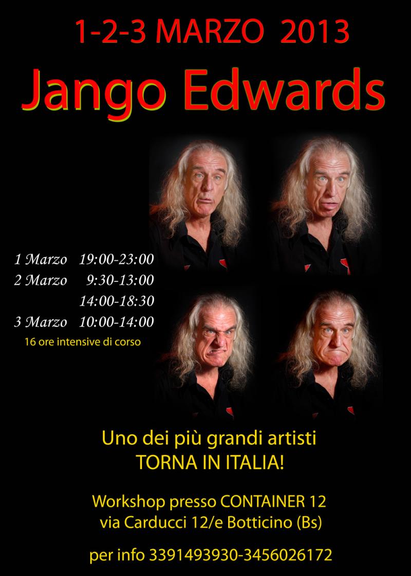 sono lieti di presentare una grande occasione: per la prima volta a Brescia JANGO EDWARDS con stage intensivo di teatro comico di 16 ore e spettacolo finale nei giorni 1 – 2 – 3 MARZO 2013.