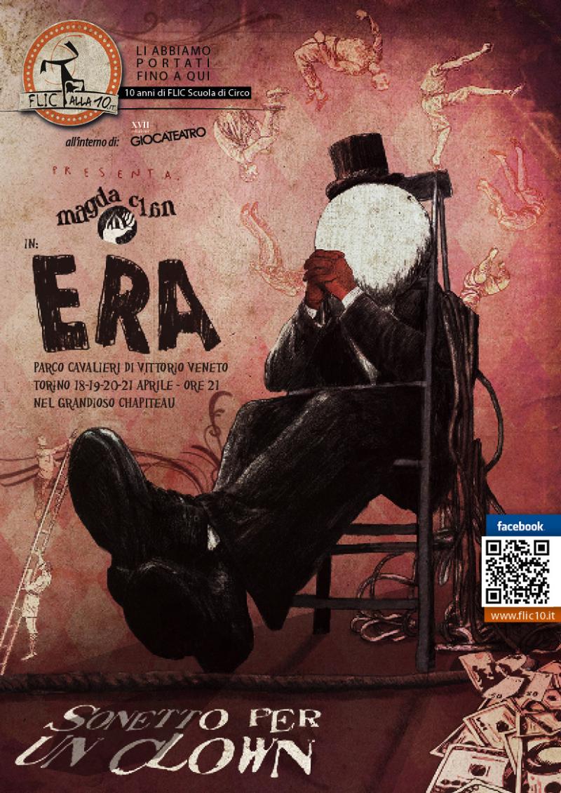 Dal 18 al 21 aprile lo spettacolo “ERA, Sonetto per un Clown” della compagnia MagdaClan viene presentato come evento speciale di ‘FLIC alla 10’, la rassegna che celebra 10 anni di formazione d’eccellenza nell’arte del circo contemporaneo da parte della FLIC Scuola di Circo della Reale Società Ginnastica di Torino ed all’interno della vetrina Giocateatro organizzata dalla Casa del Teatro Ragazzi e Giovani Piemonte.