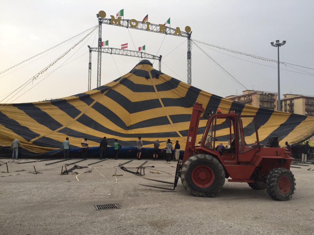 Molti circensi contribuiscono poi al montaggio dello chapiteau, correndo spesso, più o meno consapevolmente, rischi aggiuntivi.