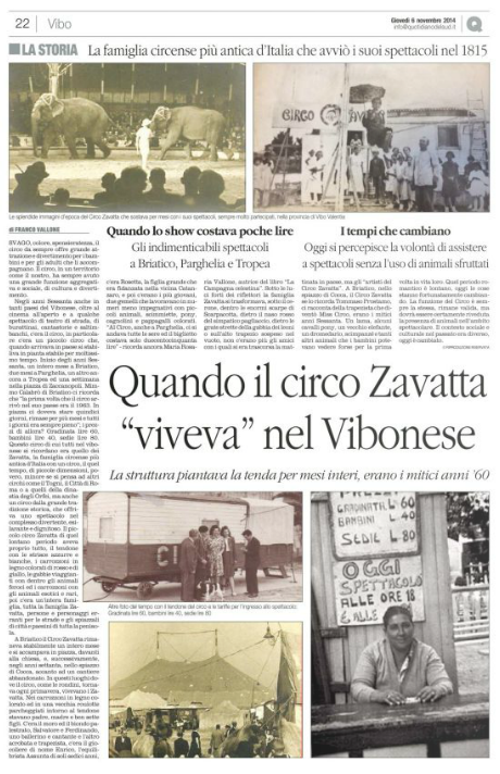 La testata giornalistica “Il Quotidiano Della Calabria“, ha pubblicato giovedì 06 novembre un articolo dedicato al circo Zavatta dal titolo “Quando il circo Zavatta viveva nel Vibonese”.