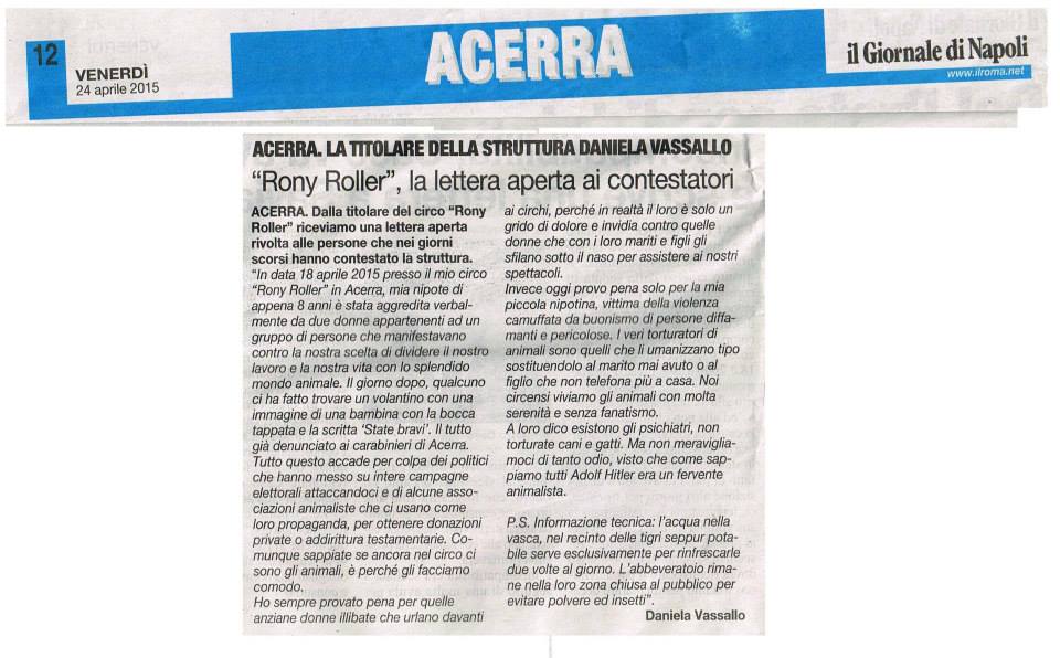 Pubblichiamo la lettera aperta pubblicata su il giornale di Napoli per i fatti successi il 18 aprile 2015 durante la manifestazione animalista presso il Rony Roller Circus della famiglia Vassallo.