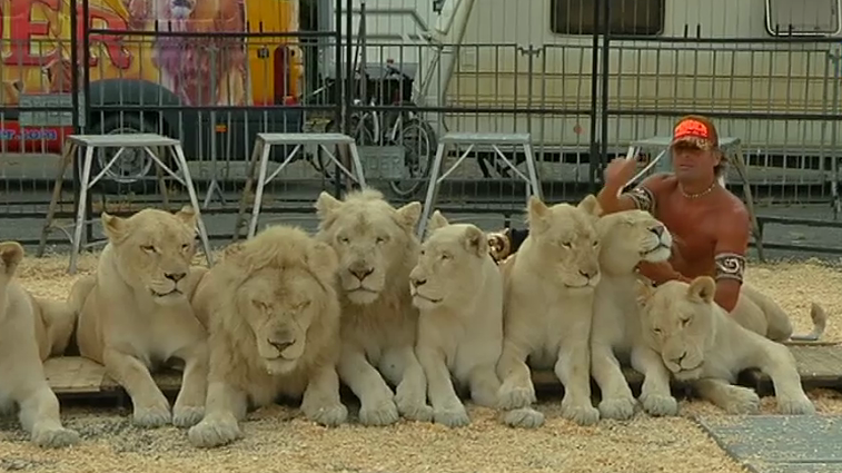 Quanto a Frédéric, che è oggi uno dei più grandi domatori della sua generazione, si esibisce sotto il tendone con dodici leoni bianchi, in un numero unico.