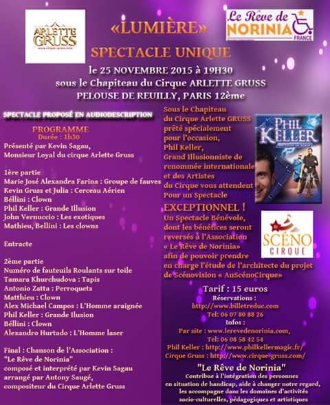 Ringraziamo Manuel Farina che ci segnala un'iniziativa benefica che riguarda il circo Arlette Gruss e l'associazione La Reve de Norinia, che si occupa di integrazione per i disabili. Questo il messaggio del domatore impegnato fino al prossimo dicembre 2016 proprio nella pista della "Cattedrale".