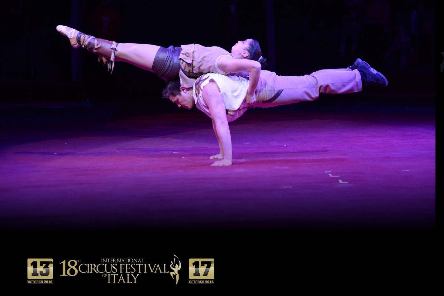 Acro duo Rustam & Sabina è il sodalizio artistico di due giovani acrobati provenienti dalla Repubblica dell’Uzbekistan, nell’Asia centrale. Sabina, in particolare, è tra i più giovani artisti presenti alla competizione di quest’anno; il suo debutto in pista risale al 2011 quando intraprese la carriera negli USA. Rustam, per contro, vanta una già lunga esperienza artistica, avviata fin dal 1998 dopo un percorso di formazione atletica. Rustam e Sabina presentano un classico dell’acrobatica circense, il “mano a mano”: audacia, vigore fisico e potenza muscolare sono qui declinati in modo originale in ragione della presenza femminile, circostanza poco comune in questa disciplina.