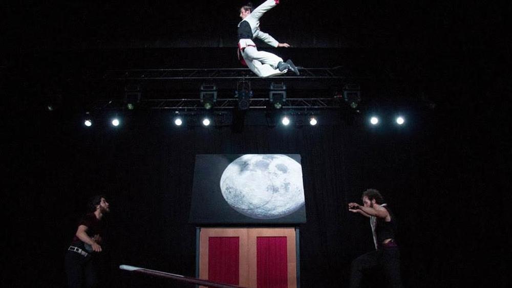 Ed è proprio questo baule che, una volta aperto, trasforma la scena in una galassia e la bascula diventa un trampolino per raggiungere un universo onirico e poetico. E con il pretesto di raggiungere il cielo, il trio mette in mostra tutta la sua vulcanica abilità comica ed acrobatica.
