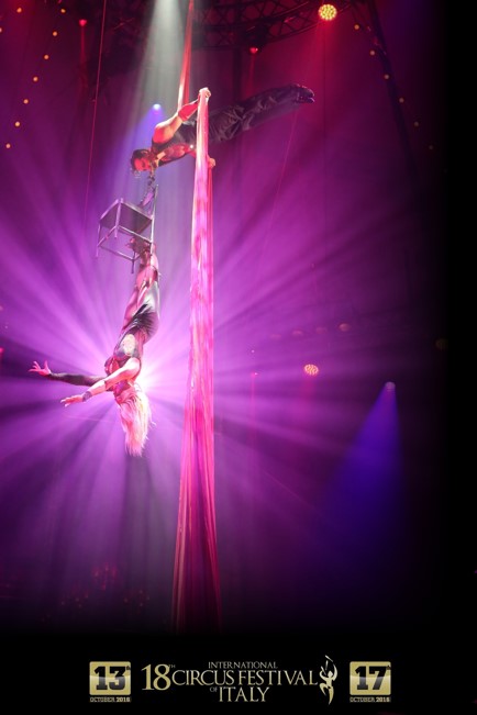 Ambra & Yves appartengono a due note famiglie impegnate nel Circo da più generazioni: lei proveniente dall’Italia, lui dalla Spagna, hanno già calcato le piste di alcuni tra i più grandi complessi circensi europei. Il loro numero di tessuti è assai più di una performance acrobatica: è musica, è canto, è un tango appassionato che prende il volo e diventa immagine di una intensa passione. Del resto la stessa disciplina, di per sé affascinante per l’impiego dei lunghi drappi di seta, acquista un particolare colore quando i performer sono una coppia. La colonna sonora che accompagna la performance è impreziosita da una partecipazione live di Yves.