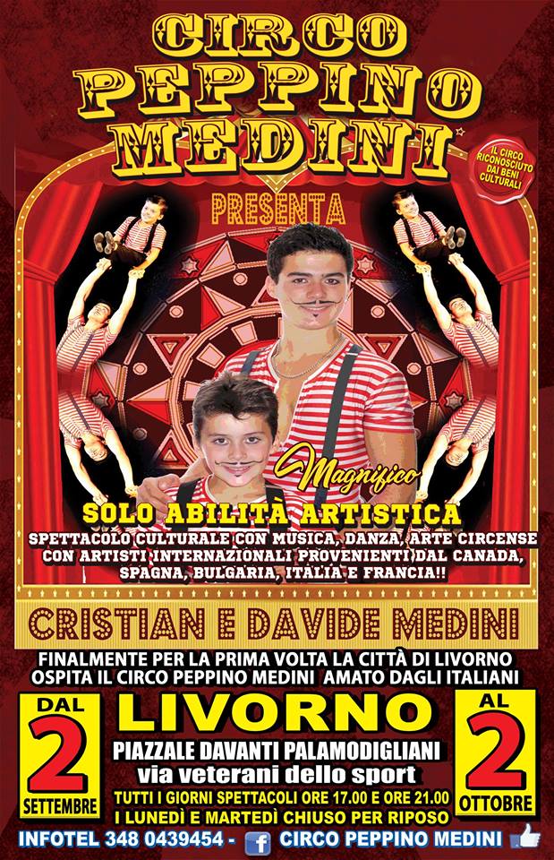 Debutta oggi, per la prima volta a Livorno, un circo tutto particolare perché, oltre a proporre spettacoli di arte circense con esibizioni di trapezisti, equilibristi, acrobati, giocolieri e clown, per sua scelta, non ha animali. Stiamo parlando del circo Peppino Medini. Il Circo ha montato il suo chapiteau a Porta a Terra, dove si fermerà da venerdì 2 settembre fino al 2 ottobre, proponendo due spettacoli (alle 17 e alle 21), tutti i giorni escluso il lunedì e il martedì.