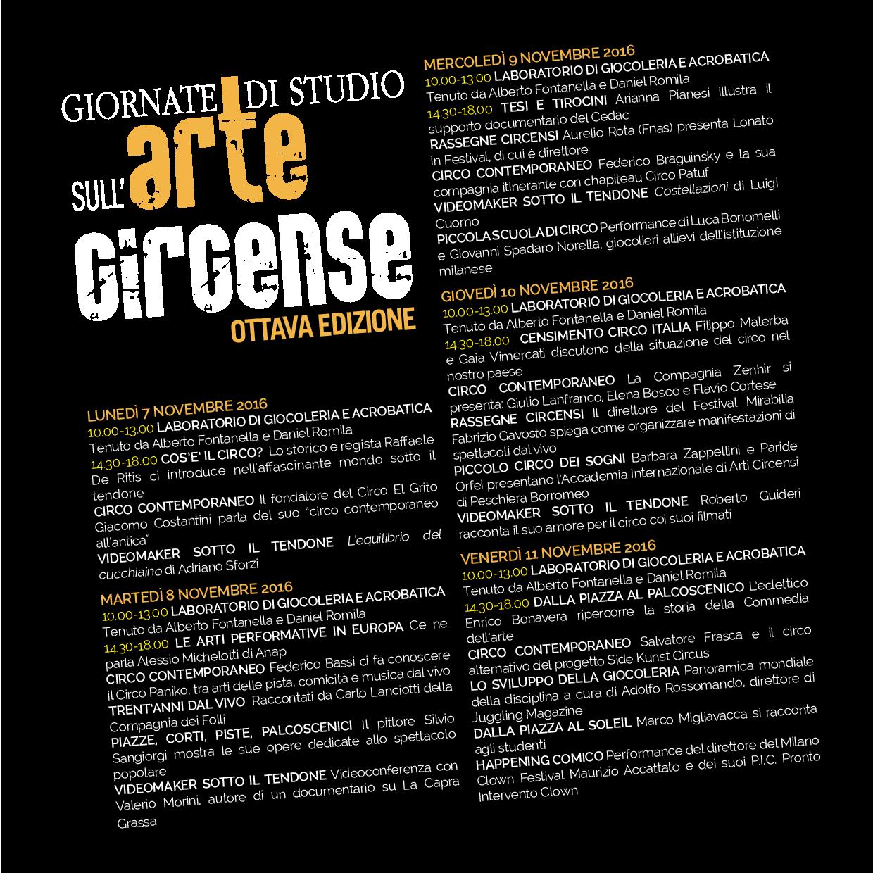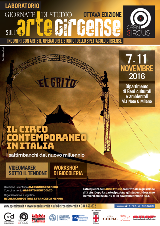 Ritornano le Giornate di Studio sull’Arte Circense all’Università degli Studi di Milano: una settimana ricca di appuntamenti con artisti e operatori del settore, spettacoli e performance dal vivo per tutti gli studenti e per tutti gli appassionati del circo. L’ottava edizione, che si svolgerà dal 7 all’11 novembre 2016 presso il Dipartimento di Beni culturali e ambientali (via Noto 8), sarà caratterizzata da un focus sul circo contemporaneo italiano e prevederà la presenza di numerose compagnie del nostro Paese. Verranno inoltre presentati i lavori di diversi videomaker che si sono concentrati sulla realtà circense. Immancabile il workshop di giocoleria, uno dei momenti più apprezzati dagli studenti di tutte le precedenti edizioni.