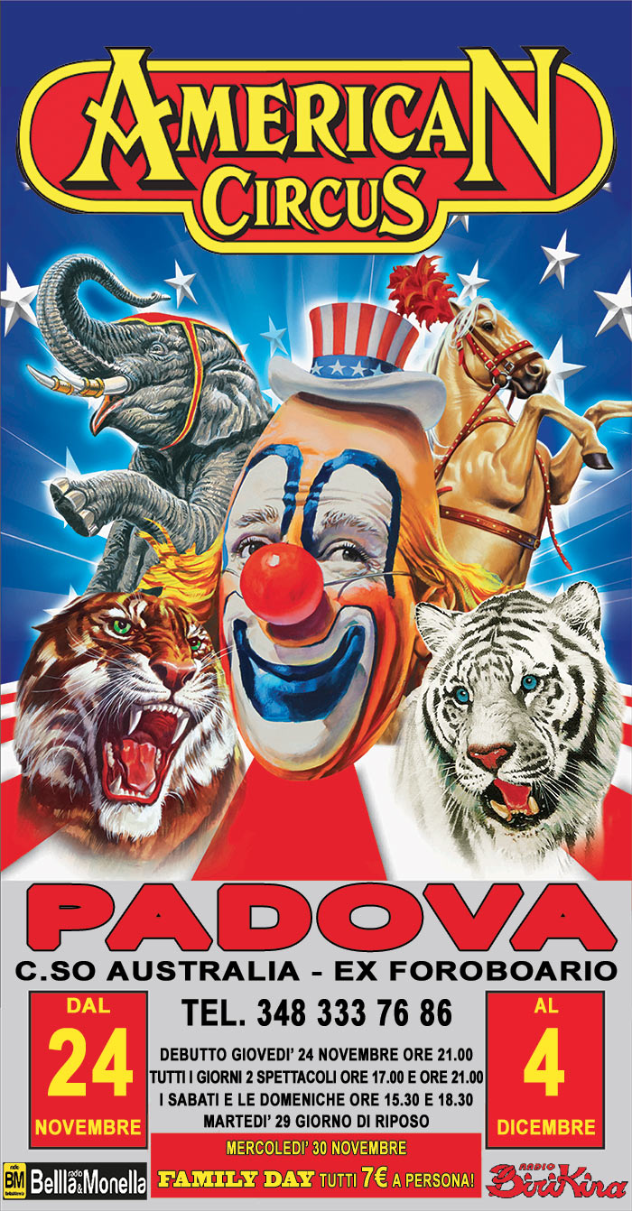 Parte da Padova il nuovo tour dell'American Circus diretto dai fratelli Flavio e Daniele Togni. La novità di quest'anno vede lo spettacolo più raccolto sotto un nuovo chapiteau ad una pista. Ricordiamo che la struttura sarà installata in Corso Australia all'ex Foro Boario a partire da domani 24 Novembre giorno del debutto e fino al 4 Dicembre. Il circo seguirà poi per la prossima tappa,la città di Mantova. Pubblichiamo qui sotto il manifesto della tappa patavina.