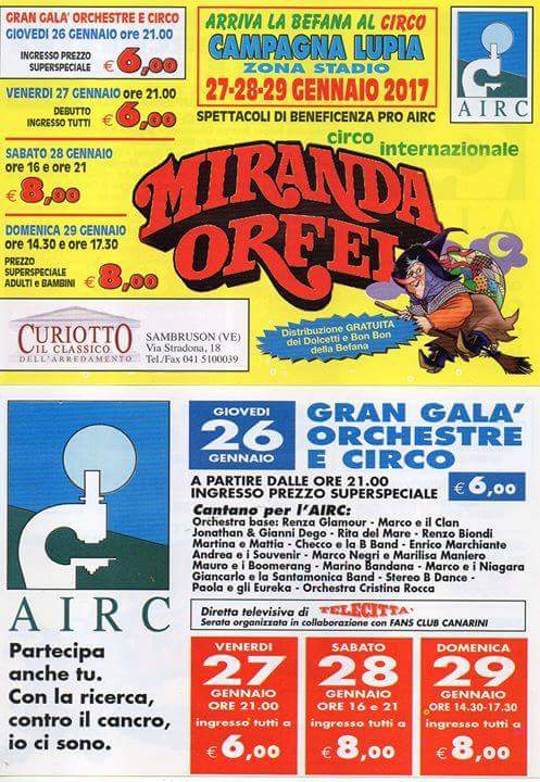 L'associazione GRUPPO PRO LUGHETTO organizza la 31°edizione di ARRIVA LA BEFANA AL CIRCO,manifestazione pro AIRC,ASSOCIAZIONE ITALIANA PER LA RICERCA SUL CANCRO,finalizzata alla raccolta fondi per la creazione di una borsa di studio per giovani ricercatori.