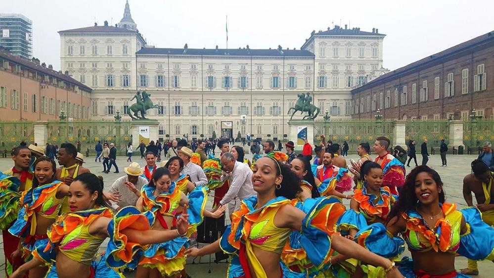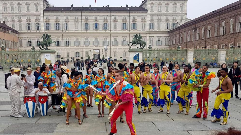 Questa mattina, sabato 7 aprile, 52 artisti di CirCuba, la compagnia di l’Havana che si esibisce nel capoluogo piemontese (sotto il grande Chapiteau installato alla Pellerina), si sono dati appuntamento in piazza Castello per proporre un best of del loro repertorio nel cuore storico della Città, tra Palazzo Reale e Palazzo Madama. Il fascino delle facciate auliche della città si è fuso con il folclore caliente dei musicisti, dei danzatori e degli acrobati cubani che hanno emozionato anche Papa Francesco della loro recente esibizione in Sala Nervi in occasione della permanenza della compagnia nella Capitale. Centinaia di torinesi, turisti, passanti, ma anche fotografi, e videomaker, hanno applaudito gli acrobati cubani, posando e danzando con loro, immortalando i salti alle corde, le pose di acrobatica, i virtuosismi dei giocolieri.
