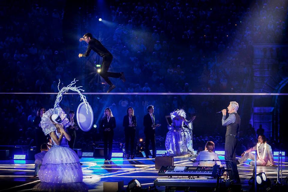 «Al centro» il titolo dell'evento, che ha visti impegnati 22 musicisti e 26 fra ballerini e acrobati e altre 50 comparse. «Tra circo e sogno, il divo Claudio Baglioni conquista l'Arena di Verona» ha scritto l'Ansa. Il Circo ha offerto un contributo di bellezza e qualità attraverso i suoi acrobati a terra e sul filo.