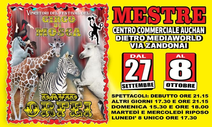 Arriva a Mestre il Circo David Orfei. Lo spettacolo con artisti di caratura internazionale, premiati al Festival di Mosca, sarà in Città dal 27 settembre all’ 8 ottobre in zona centro commerciale Le porte di Mestre, in via Zandonai (dietro MediaWorld). Lo show circense, unico nel suo genere, è pronto a stupire il pubblico con numerose attrazioni.