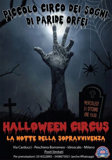 PESCHIERA BORROMEO (IDROSCALO – MILANO). 3 ottobre 2018 – In occasione della festa di Halloween del 31 ottobre, il Piccolo Circo dei Sogni di Paride Orfei presenta “Halloween Circus”, un grandioso spettacolo con un’importante compagnia di artisti circensi e ballerini. Truccati e agghindati con costumi di scena orripilanti, sapranno regalare al pubblico un sorprendente e variegato repertorio, strutturato in esibizioni aeree, discipline acrobatiche, equilibrismo, giocoleria, trapezio, danze e molto altro (solo arte umana, al Piccolo Circo dei Sogni non vengono usati animali). Per questa data anche il tendone del circo assumerà altre sembianze: sarà tramutato in un luogo mostruoso, con ragnatele, pipistrelli, zucche, etc.
