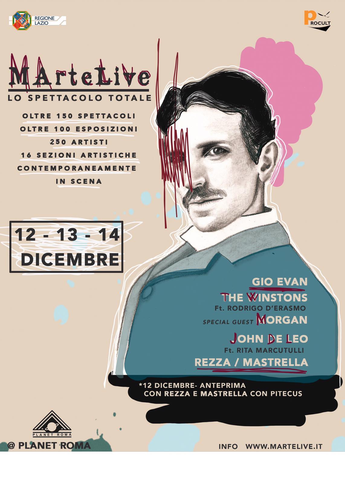 Al Planet Live Club di Roma il 12 dicembre l'anteprima con i Leoni d'Oro alla carriera Antonio Rezza e Flavia Mastrella e il loro celebre spettacolo “Pitecus”. Il 13 e 14 dicembre la 2 giorni MArteLive che vedrà tra gli ospiti John De Leo con special guest Rita Marcotulli, Gio Evan, The Winstons feat. Rodrigo D’Erasmo special guest Morgan, Bunna (Africa Unite), Istituto Italiano di Cumbia e Gianluca Secco oltre a circa 250 artisti e 16 disclipline artistiche tra musica, teatro, danza, arte visiva, reading, artigianato artistico, cinema.