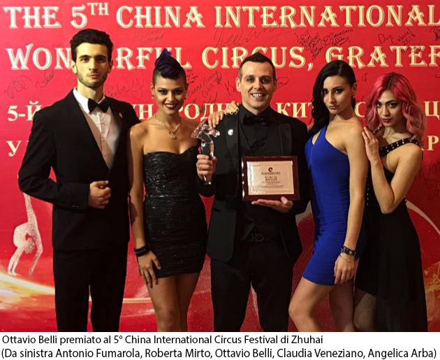 La premiazione di Ottavio Belli al 5° China International Circus Festival di ZhuhaiI premi riguardano “Premio speciale della giuria” e “Premio Excellent Act” che gli ha consentito di esibirsi al Gala of Excellent Act svolto nei giorni successivi al Festival. Subito dopo si è aggiunto un anno di contratto presso il Parco Divertimenti del Chimelong Paradise.