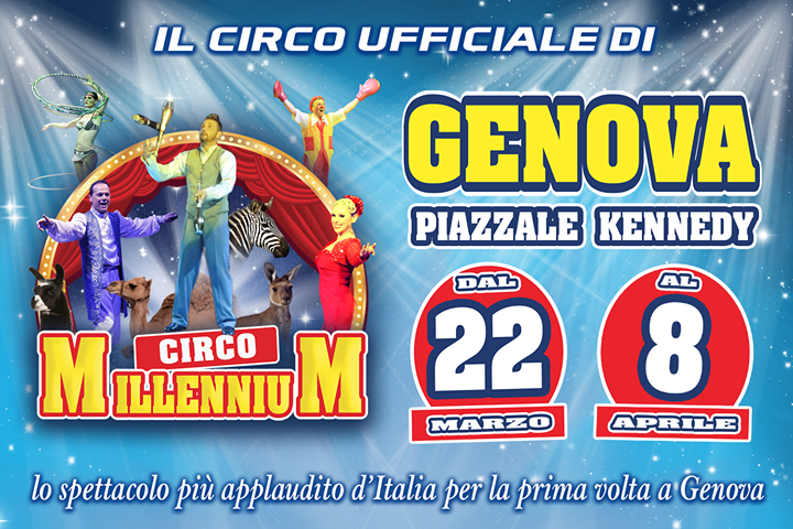 Il Circo Millennium dei F.lli Coda Prin è a Genova. Un altro ottimo traguardo per il circo che aggiunge Genova alla sua fortunata tournée dopo Brescia, Imola, Modena, Ravenna e Cesena dove lo spettacolo ha riscosso un ottimo successo. Il Millennium è in scena nel capoluogo ligure dal 22 Marzo all' 8 Aprile nella storica piazza del circo ovvero Piazzale Kennedy. Per l’occasione lo spettacolo viene presentato nello chapiteau a castello giallo e blu della ditta Rossante.