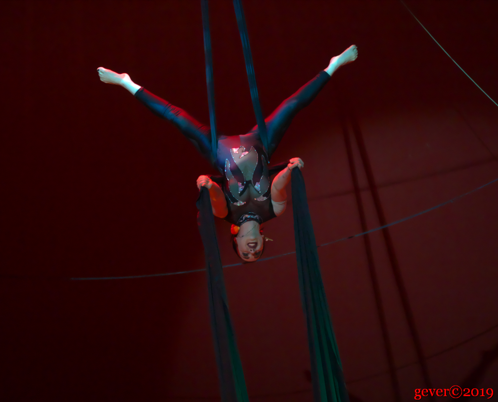 Evelin si esibisce con un numero di hula hoop e di tessuti aerei, specialità alla quale ha iniziato a dedicarsi dall'età di 16 anni, sotto la guida di Trisha Martini.
