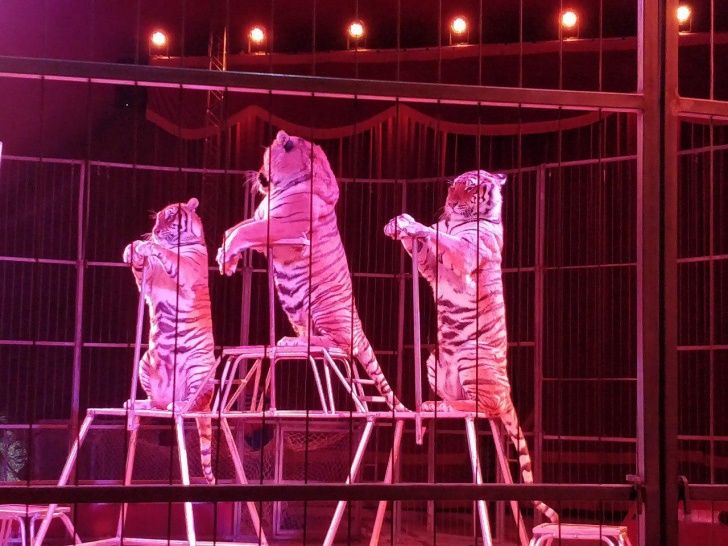 Nelle foto le tigri di proprietà di Stefano Rossi, durante lo spettacolo e nel loro recinto.