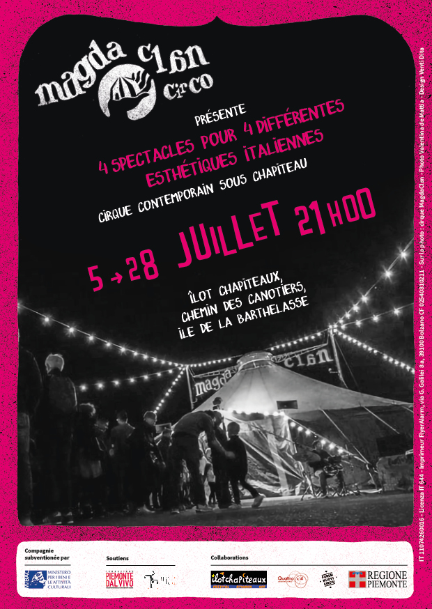 Tra le varie compagnie italiane presenti ad Avignon OFF, MagdaClan è l’unica di circo contemporaneo con tendone. Dal 5 al 28 luglio, nell’area di Ilot Chapiteaux, vanno in scena ben quattro spettacoli che coinvolgono più di 30 artisti: Emisfero (2018), È Un Attimo (2016), Ah, com’è bello l’Uomo (2016) e Amygdala (2019) sono le produzioni presentate che hanno una peculiarità poetica ed estetica riconducibili ad una tipicità italiana e allo stesso tempo permetteranno di mostrare diverse sfaccettature del linguaggio artistico della compagnia. MagdaClan infatti unisce all’immaginario tradizionale del circo e della vita itinerante, l’innovazione di un linguaggio contemporaneo, poetico, ironico e multiforme che mette in rete le diverse arti ed è metafora della complessità che abita il contemporaneo.