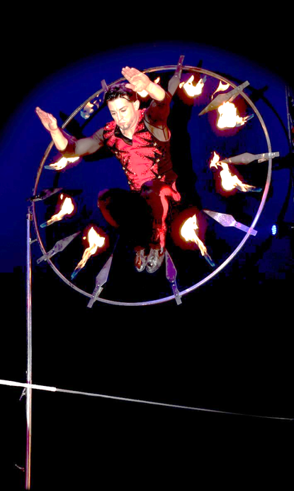 Nell’immaginario collettivo il funambolo è quell’artista capace di camminare e compiere evoluzioni sul filo: il “filo teso” è dunque una disciplina cara alla più antica scuola circense. Nicol Nicols, nato a Valencia, in Spagna, nel 1981, fin dall’età di 16 anni ha preso ad interpretare in chiave moderna questa antica tradizione con una performance che ad oggi lo ha visto protagonista in alcuni tra i più importanti complessi circensi al mondo. All’interno di una coreografia impreziosita da un assolo di violino, Nicol Nicols presenta ogni virtuosismo possibile sul filo teso, dal salto nel cerchio di fuoco al salto mortale indietro, fino al difficilissimo salto mortale in avanti.