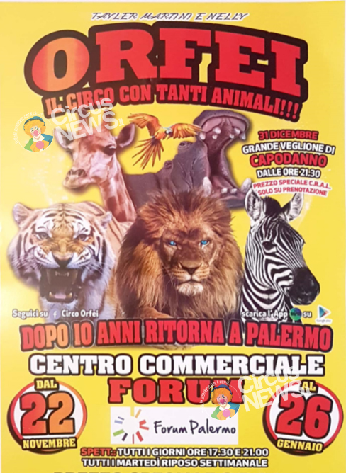 Il Circo Nelly Orfei diretto da Tayler Martini trascorrerà le festività natalizie a Palermo presso il Centro Commerciale Forum. Gli spettacoli si terranno dal 22 Novembre 2019 al 26 Gennaio 2020.
