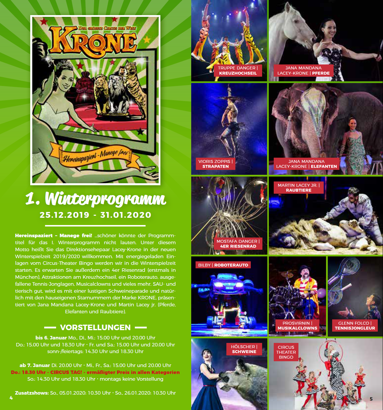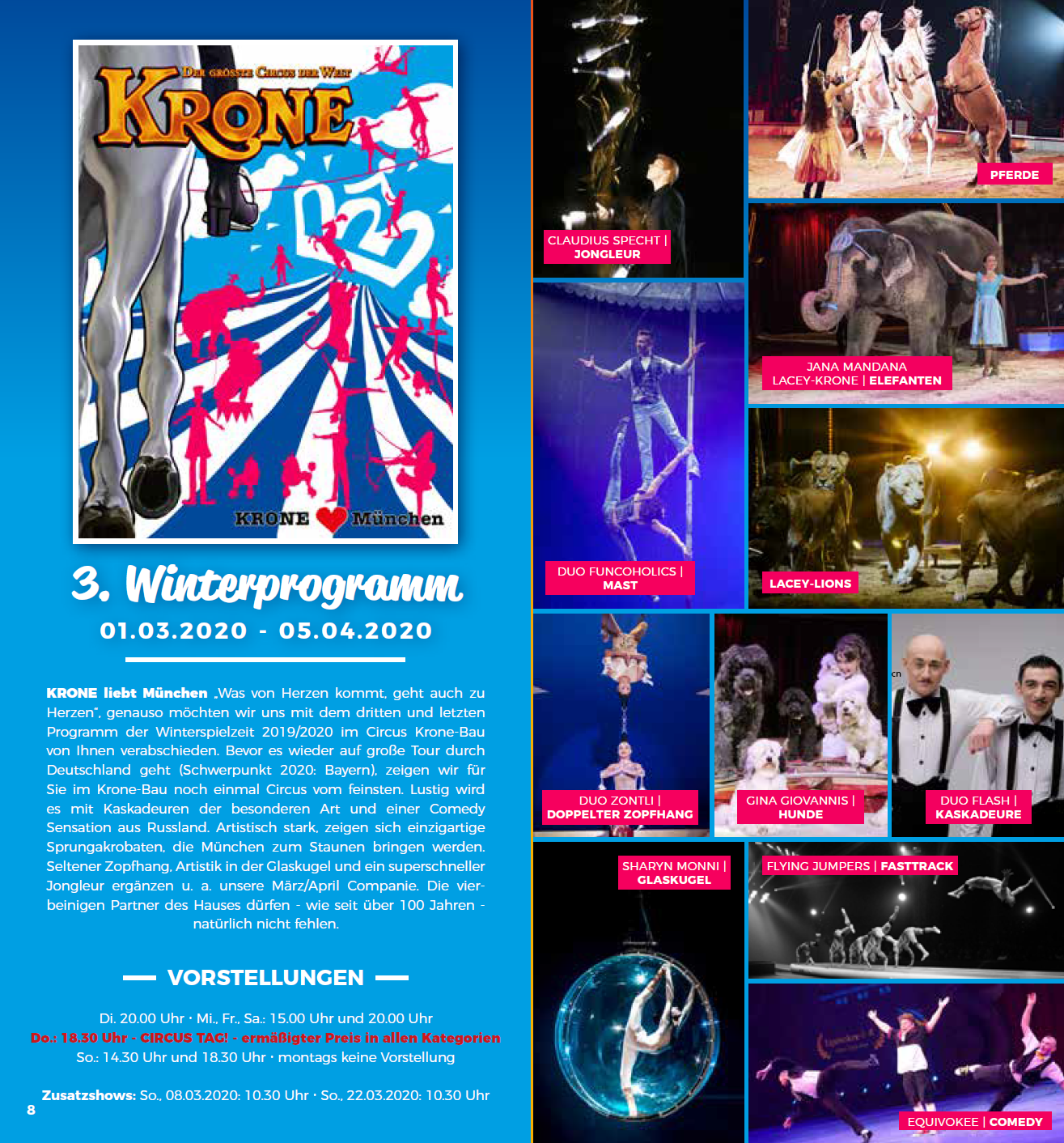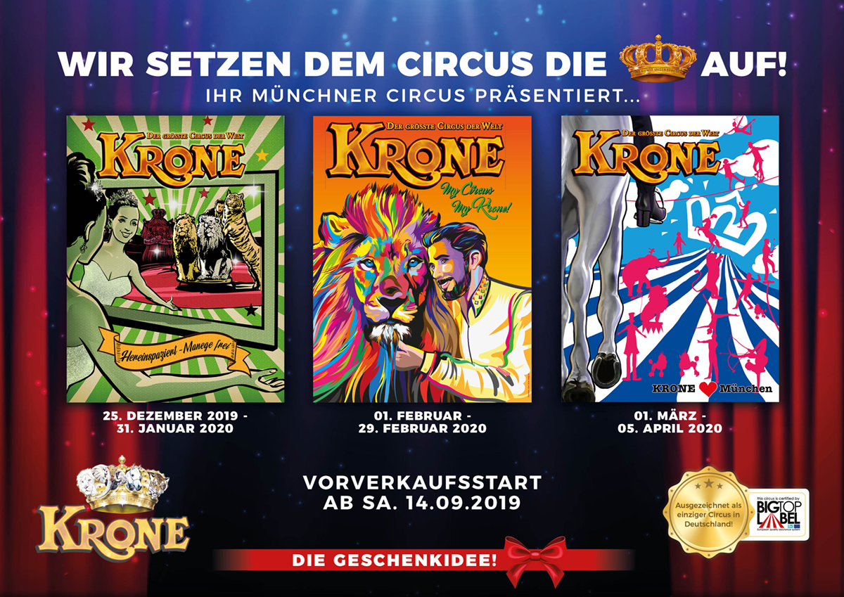 Ogni inverno il Circus Krone presenta tre programmi circensi internazionali completamente diversi nella sua sede stabile a Monaco di Baviera, in Germania. Anche quest'anno la stagione invernale inizierà il 25 dicembre 2019 e proseguirà fino al 5 aprile 2020. Diversi saranno gli artisti italiani che vi prenderanno parte.