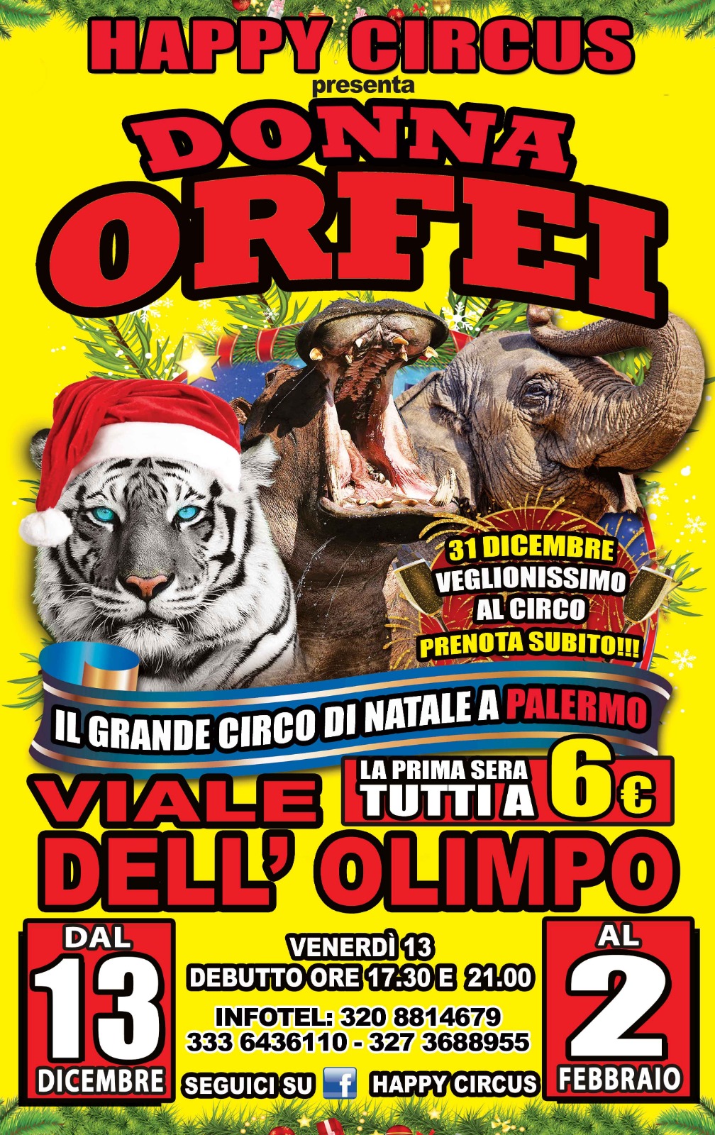 Sarà a Palermo da venerdì 13 dicembre 2019 sino al 2 febbraio 2020 il circo Happy Circus Donna Orfei con due show al giorno. Il circo sarà allestito in viale dell'Olimpo. Il debutto è venerdì 13 dicembre con due spettacoli: ore 17.30 e ore 21. Con un prezzo unico: 6 euro a persona (solo per la prima sera).