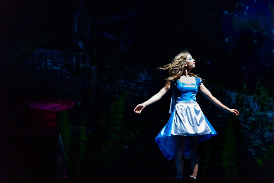 Mentre sei inservienti si occupano dello smontaggio dei pali cinesi, Rose Winebrenner, cantante e polistrumentista di Chicago (Usa), per tanti anni vocalist nello spettacolo Zaia del Cirque du Soleil, fa sfoggio della sua bellissima voce, creando un’atmosfera unica all’ingresso di Anastasiia Vashchenko, che affida il suo mantello ai Jumping Dragon, mentre dall’alto cala un lampadario scintillante. L’artista russa (un curriculum di tutto rispetto, dal Cirque du Soleil al Ringling Bros Barnum & Bailey) ha appositamente creato per Alis una suggestiva attrazione aerea al lampadario oscillante, dove contorsionismo, trapezio e acrogym si fondono insieme a sei metri di altezza.