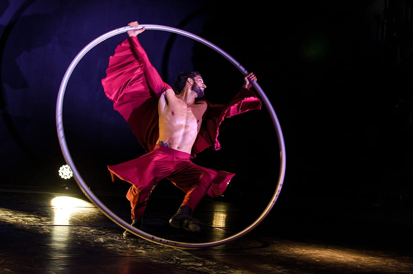 La ruota Cyr è un attrezzo di recente introduzione e, non di rado, chi la presenta ne dà una interpretazione alquanto statica o perlomeno molto meccanica. Non è sicuramente il caso di Andrea Cerrato, uno dei pochi italiani del cast, formatosi alla Scuola di Cirko Vertigo di Torino, con solide basi di ballerino classico ed hip-hop, oggi votato a questa disciplina alla quale conferisce una connotazione molto particolare. La sua performance rappresenta la fenice, il mitologico uccello di fuoco che rinasce dalle proprie ceneri e il costume rosso a frange leggere svolazzanti contribuisce a creare l’effetto “fiammeggiante” durante le evoluzioni acrobatiche che l’artista presenta con padronanza tecnica e grande espressività. L’attrezzo viene poi agganciato e sollevato in aria e la ruota cyr si trasforma in cerchio aereo: è il volo della fenice. Andrea Cerrato non proviene dal Cirque du Soleil, ma c’è la convinzione che il suo posto sia là.
