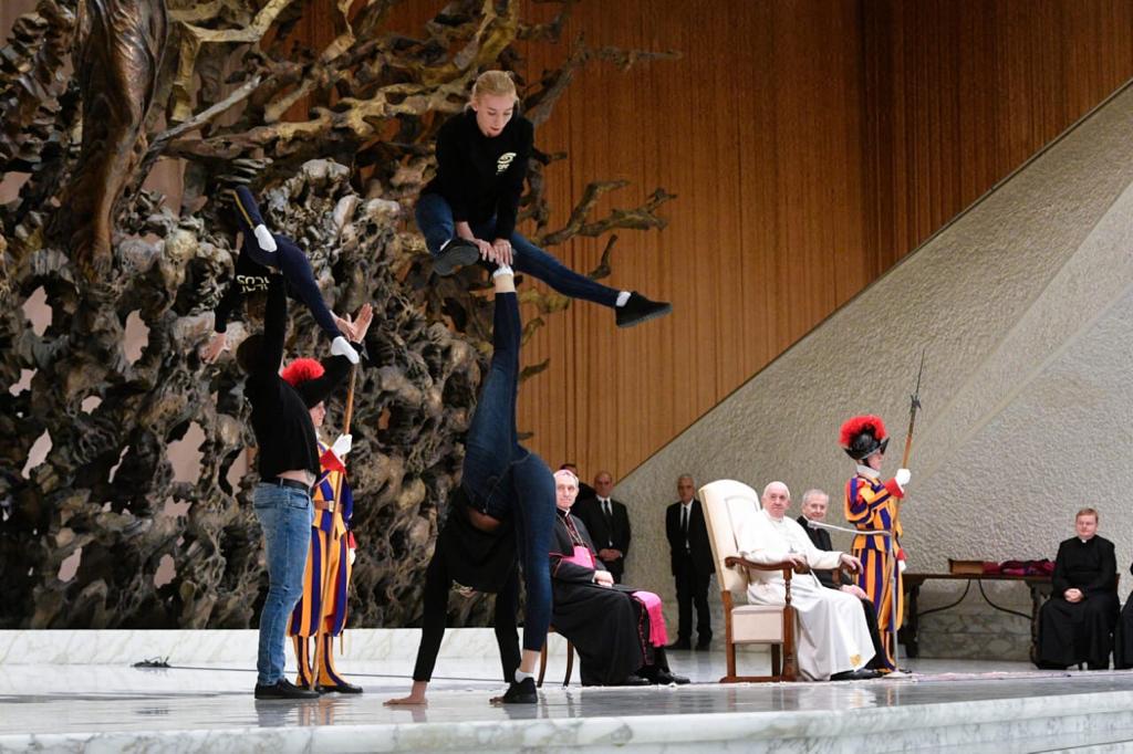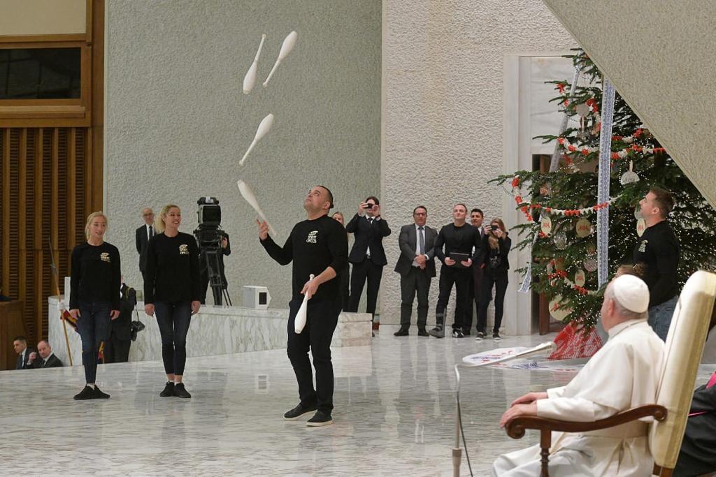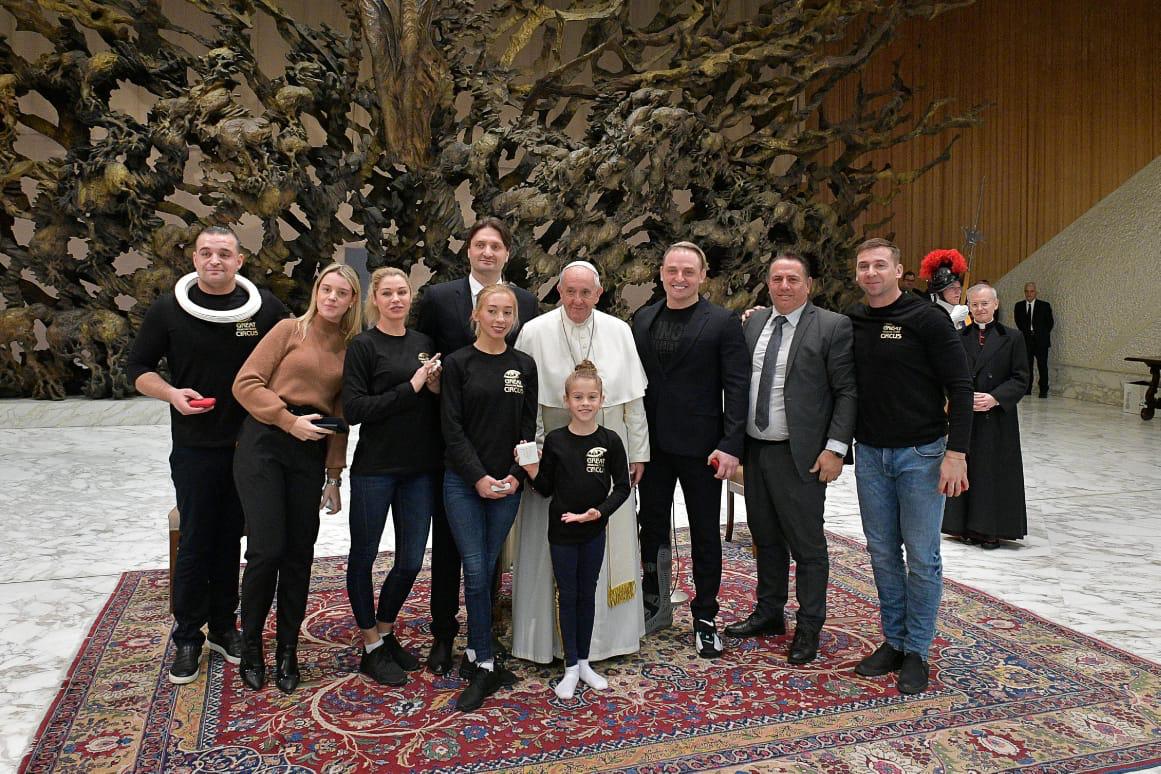 Vaticano 11 Dicembre 2019, gli artisti del gran circo di Mosca, accompagnati dai fratelli Askold & Edgard Zapashny, hanno arricchito una tradizionale udienza del Santo Padre, che si è svolta all'interno dell'aula Paolo VI, celebrando l'arte circense nelle sue discipline tipiche.