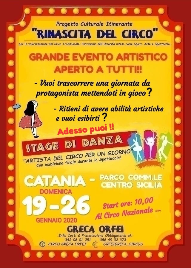 Catania, martedì 17 dicembre 2019 – Il circo Greca Orfei offre la possibilità di diventare "artista per un giorno" con uno stage di danza coreografica, che si svolgerà giovedì 19 gennaio dalle ore 10 e domenica 26 gennaio 2020. L'appuntamento è al circo Greca Orfei all'interno del centro commerciale "Centro Sicilia" di Catania. Al termine dello stage si ha la possibilità di esibirsi durante lo spettacolo. Un'esibizione con artisti di fama internazionale. Ci saranno acrobati, giocolieri, trapezisti, clown, illusionisti. E ancora: in esclusiva dall'America lo Slinky. Dagli artisti di fama internazionale agli amici animali: tra gli altri, i simpaticissimi elefanti indiani curati dalla famiglia Garteners e poi l'unico esemplare in Europa di Leontigre. In più si potranno visitare nel parco gli animali la domenica e i giorni festivi dalle ore 10.00 alle ore 13.00.