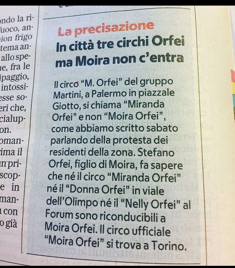E’ capitato a Palermo, dove una titolazione M. (puntato) Orfei è stata interpretata e riportata su un articolo come “Moira Orfei”. Giustamente il figlio Stefano ha inviato una precisazione informando che il circo titolato Moira Orfei si trova a Torino e non a Palermo dove peraltro si trovano ben 4 circhi, 3 dei quali a denominazione Orfei (Donna – Nelly – M. che sta per Miranda).
