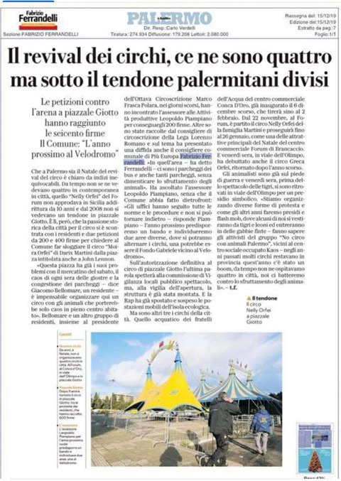 Quattro circhi presenti per le festività a Palermo, dove già ne passano diversi durante l’anno, e intere regioni e città senza un circo. Completa confusione e mancanza di pianificazione, da parte degli impresari e delle associazioni di categoria quali l’ENC, sulla turnazione dei circhi.