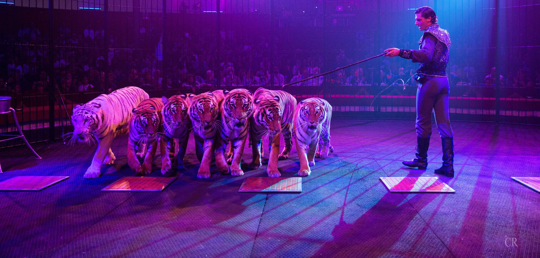 Immaginate una gabbia al buio. Solo una flebile luce delinea i contorni sinuosi degli animali che entrano silenziosi nella gabbia e balzano sugli sgabelli. Improvvisamente, una luce fredda, bianca, dal basso, illumina fugacemente otto tigri sedute. Poi, le luci si accendono, piene e calde, e scroscia l’applauso del pubblico, ma quell’istante resta indelebile, impresso nella mente: le tigri che si rivelano nel buio, con la loro agghiacciante simmetria.