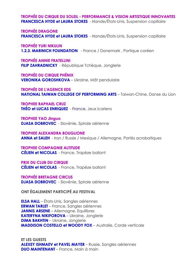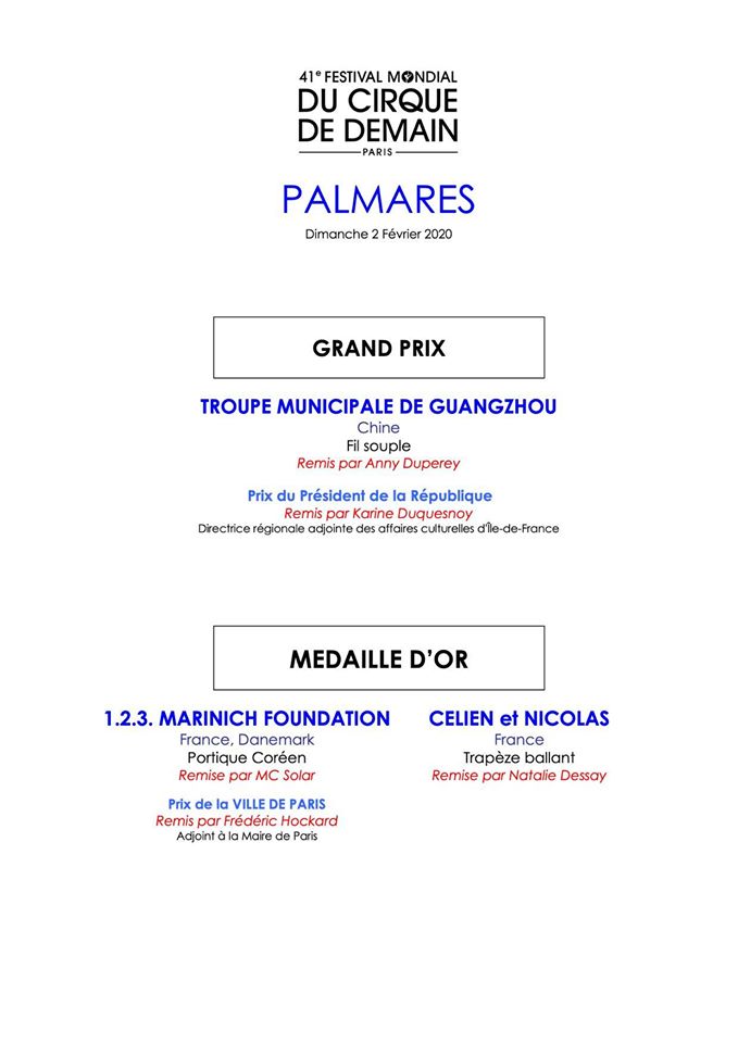 Si è conclusa ieri 2 febbraio la quarantunesima edizione del Festival Mondial du Cirque de Demain a Parigi presso il Cirque Phènix. Il festival celebra le discipline corporee ed è riservato ai giovani artisti con età inferiore a 25 anni. Di seguito l'elenco con tutti i premi assegnati dalla giuria presieduta da Maxim Nikulin, presidente e direttore generale del Circo Nikulin di Mosca.