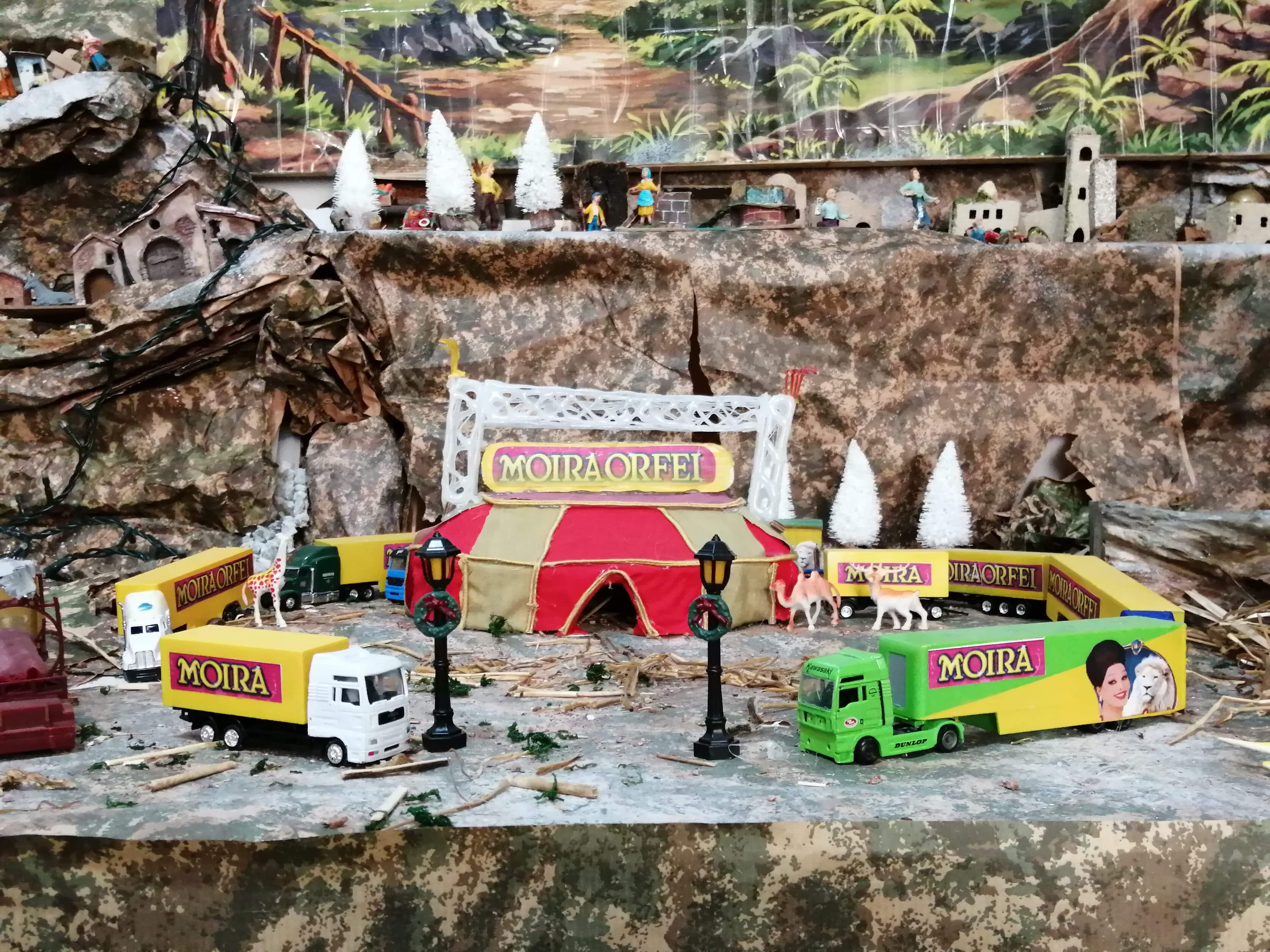 Costruita la struttura portante in metallo, Maisano ha allestito il tendone con ritagli di stoffe cerate e colorate, ha poi successivamente griffato, uno dopo l’altro, tutti i modellini di camion, motrici, roulotte e carrozzoni della carovana circense con i colorati loghi del circo di Moira Orfei. I colori sgargianti degli automezzi con il giallo, il rosso, l’arancio e il verde chiaro, i recinti, gli animali esotici, l’illuminazione…un lungo e paziente lavoro di piccoli particolari che testimonia la sua grande passione per il mondo del circo.