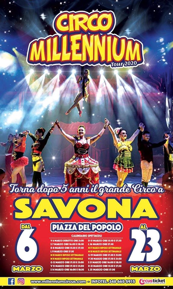 Dopo 5 anni di assenza torna il Circo a Savona in Piazza del Popolo, dal 6 al 23 Marzo ad esibirsi sarà infatti il Circo Millennium dei F.lli Coda Prin, che giunge nella città per la prima volta in assoluto. Una mini città itinerante che installerà le proprie strutture nell’area adiacente a Piazza del Popolo. Uno spettacolo della durata di due ore magistralmente condotto sotto la regia della Famiglia Coda Prin unitamente alla Famiglia Niemen, una delle più storiche famiglie circensi.