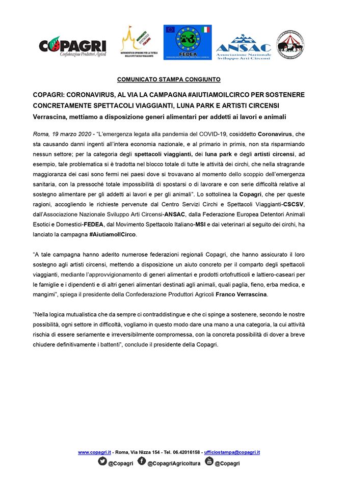 Roma. 19 marzo 2020 – “L’emergenza legata alla pandemia del COVID-19, cosiddetto Coronavirus, che sta causando danni ingenti all’intera economia nazionale. e al primario in primis. non sta risparmiando nessun settore; per la categoria degli spettacoli viaggianti, dei luna park e degli artisti circensi, ad esempio, tale problematica si è tradotta nel blocco totale di tutte le attività dei circhi, che nella stragrande maggioranza dei casi sono fermi nei paesi dove si trovavano al momento detto scoppio dell’emergenza sanitaria, con la pressoché totale impossibilità di spostarsi o di lavorare e con serie difficoltà relative al sostegno alimentare per gli addetti ai lavori e per gli animali”. Lo sottolinea la Copagri, che per queste ragioni, accogliendo le richieste pervenute dal Centro Servizi Circhi e Spettacoli Viaggianti-CSCSV, dall’Associazione Nazionale Sviluppo Arti Circensi-ANSAC, dalla Federazione Europea Detentori Animali Esotici e Domestici-FEDEA., dal Movimento Spettacolo Italiano-MSI e dai veterinari al seguito dei circhi, ha lanciato la campagna #AiutiamollCirco.