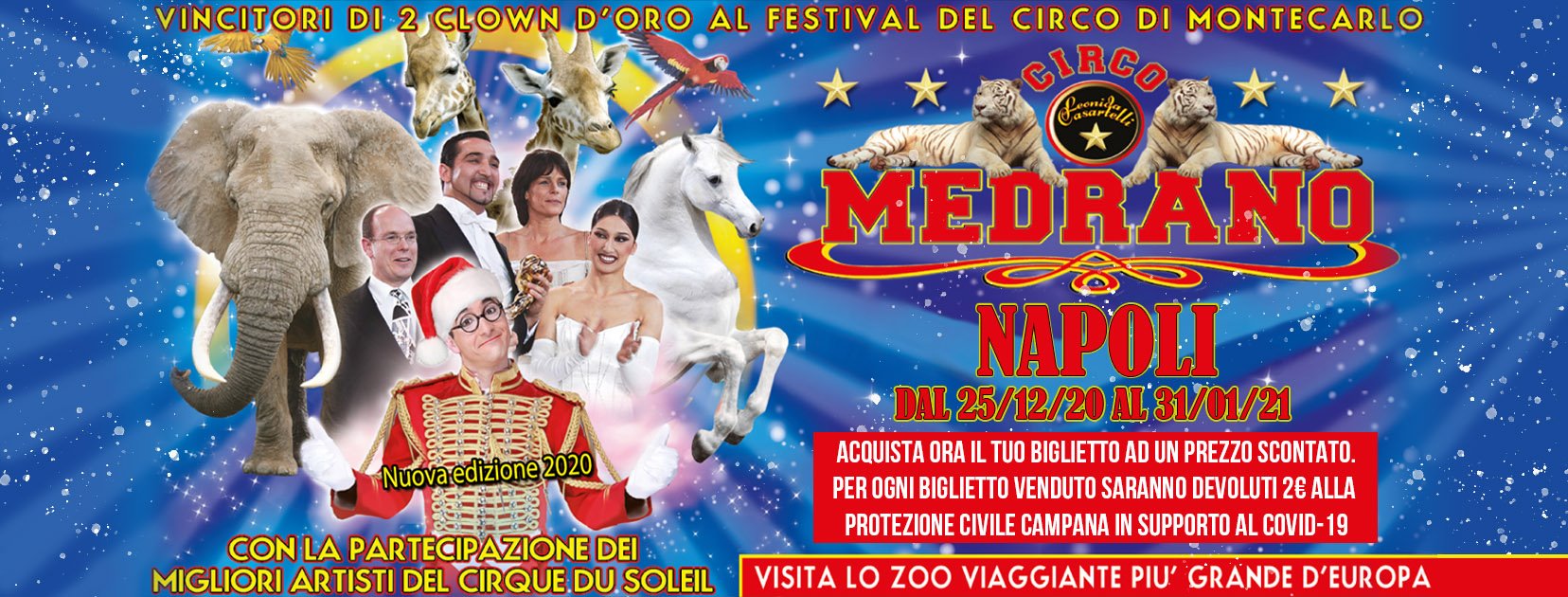 Acquistando i biglietti in anticipo, in promozione fino al 31 agosto, il Circo Medrano devolverà 2 euro alla Protezione Civile Campana per ciascun biglietto venduto per supportare l'emergenza Covid-19.